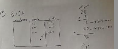 CKD: We wanted to break it down. Rather than looking at it as 24 • 3 (in problem 1), it was really 3 • 4 ones and 3 • 2 tens. The words reminded us which place value column we were working in so we could include the zero for when we calculated 3 • 2 tens. The arrows made us remember the grouping strategy, so we knew what to enter in the boxes. The dots in the boxes needed to match our multiplication answer.