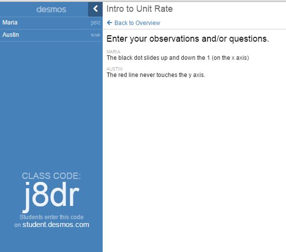 Notes: Students liked the animation aspect of the graph. I read through their responses quickly and jotted down names of students who wrote interesting observations or asked a great question. I organized their names in the order I wished the information to be shared. Then called on the students to share out what they wrote.