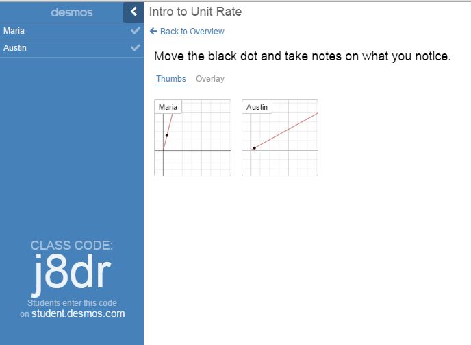 - Student names do appear on the thumbnails. I wish Desmos’ Activity Builder had a Teacher View/Student View toggle option like Plickers and Verso, for there are times when both teachers and students would prefer responses to be anonymous. I have emailed them this request.